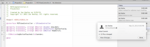 In this example, I have added a label to the storyboard with a corresponding property in the view controller, and have added a new class to the project. I only want to commit the label changes, so I have selected those and added a commit message in the bottom section. In addition to making file level selections for a commit, Xcode can do line level selections for a commit.