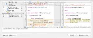 Branches can be a very effective tool to isolate new features or experiments in code. Xcode has pretty good support for branches, but it is not shown in the project view. The first method you can use to commit code to a branch is to select “Commit to Branch…” instead of “Commit X Files” from the commit view.
