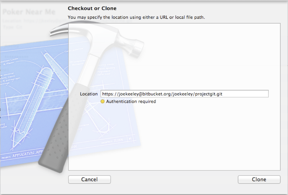 Provide your credentials and click OK. Xcode will store your credentials in the keychain for subsequent accesses of the remote repository. Note that Xcode can also handle ssh key authentication in addition to name and password. Once Xcode has authenticated with the remote repository, Xcode will request a location to store the project, and then project will be cloned. Once cloned the project can be opened or shown in the finder.