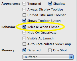 Note that this is the default setting for new windows and if you forget to turn this off (when appropriate) then bad things like this will happen. In this example, when you close the About window, the nib helpfully calls release on that window and deallocates the memory it held. Then when the NSMenu attempts to reference it again (clicking on the app menu a second time) you get a EXC_BAD_ACCESS (SIGSEGV)
